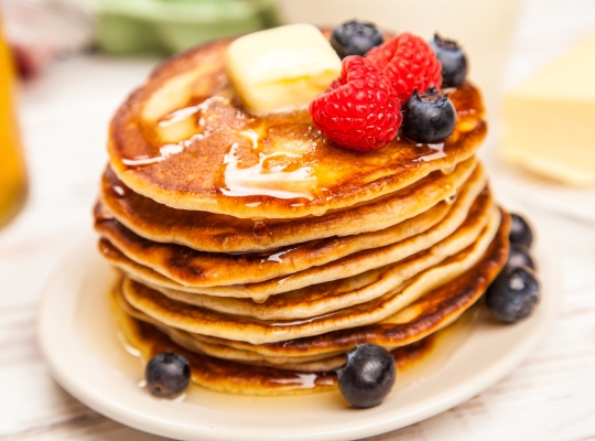 Indulge in fresh Eggs Benedict, Pancake Stack, and Breakfast Burrito.